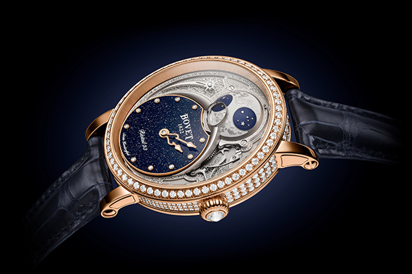 亨利慕时以勇创者恒动月相砂金石概念腕表(Endeavour Perpetual Moon Concept Aventurine)带您探索银河深处。为了向月球致敬,这枚腕表以极简却又富含诗意的手法诠释月相,摒弃时标与品牌标志的砂金石表盘闪烁光芒……6时位置的银月在比例优美的显示窗内由盈转亏,充满绝对的现代感与低调的外观。为了颂扬纯净,亨利慕时选用概念表盘,舍去时标与品牌标志,完整凸显月亮之美。亨利慕时选用砂金石表盘,借着隐约闪烁的光芒完美诠释夜空中的满天星星,让月色之美更上层楼。