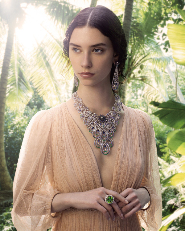 于海瑞温斯顿Harry Winston而言,雍容华贵一词淋漓尽致地诠释了品牌全新Majestic Escapes高级珠宝系列的精髓。Majestic Escapes系列开启一场珠宝相伴的感官之旅,从阿马尔菲海岸争奇斗艳的三角梅到圣托里尼代表性的蓝色圆顶建筑;从科罗拉多大峡谷的落日余晖到郁郁葱葱的热带雨林;从粉色沙滩到碧水微澜,Majestic Escapes高级珠宝系列包含八套珠宝套装。其中,Rainforest Suite珠宝套装涵盖项链、耳环和戒指,采用深浅不一的绿色沙弗莱石,以如雨林般葳蕤的宝石惟妙惟肖地勾画自然奇景,呈现丰富多样的森林景观。