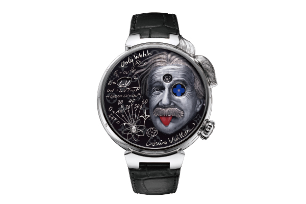 在本届拍卖中,路易威登推出Tambour Einstein动偶腕表,由路易威登La Fabrique du Temps高级制表工坊制造的525机芯在标志性的Tambour表壳内驱动表盘运转。此款孤品腕表的亮点在于做工精美的表盘,融合微雕与灰调珐琅这两大历史悠久的手工技术,以阿尔伯特·爱因斯坦举世闻名的鬼脸肖像照为原型,栩栩如生地描绘出俏皮吐舌的大师形象。爱因斯坦头像左侧的粉笔板书字迹,凸显其划时代的学术研究成就,其中一行“E = LV²”借助趣味涂鸦艺术致敬著名的质能方程“E = MC²”。表盘底部的四价轨原子模型代表爱因斯坦在量子力学领域的不朽贡献。细心的观察者还会发现原子模型中藏有一朵路易威登Monogram尖形花。爱因斯坦额头上的小圆孔内露出一个尚未解出的等式“T = ?”爱因斯坦标志性的乱发通过镂雕技艺得以再现,其中一绺头发仿佛穿透直径46.8毫米的表壳,被巧妙地改造为操控动偶的按钮。按下这个按钮,可启动表盘上的四种动态效果,解答一切疑问。