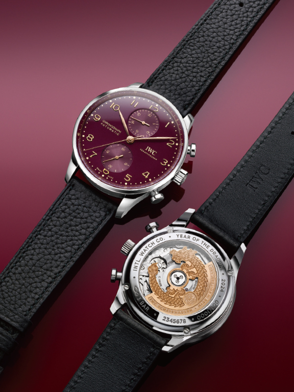 瑞士制表名家IWC万国表推出葡萄牙系列计时腕表限量版,迎接中国农历新年。这款计时腕表采用41毫米精钢表壳,搭配勃艮第红色表盘、醒目镀金指针与时标,兼具经典与优雅风范,限量发售1,000枚。透过蓝宝石玻璃表背,腾龙造型摆陀跃然而出,灵动耀目。