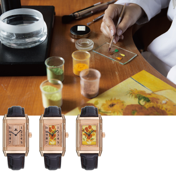 积家与荷兰阿姆斯特丹的梵高博物馆(Van Gogh Museum)合作推出积家Reverso à Eclipse隐藏式珐琅彩绘腕表,表盘图案为梵高代表作品《向日葵》,以向梵高致敬。这幅创作于1889年的名作现藏于梵高博物馆,是梵高晚年的代表作品。Reverso à Eclipse隐藏式珐琅彩绘腕表配备18K玫瑰金表壳,搭载积家品牌自制849机芯,珐琅工艺大师以极致的灵巧与耐心,诠释了富有传统魅力的珐琅微绘工艺。表盘帘幕可以轻松打开,梵高的画作《向日葵》犹如隐匿于表盘之下的瑰丽珍宝,随着帘幕徐徐展开而呈现眼前。