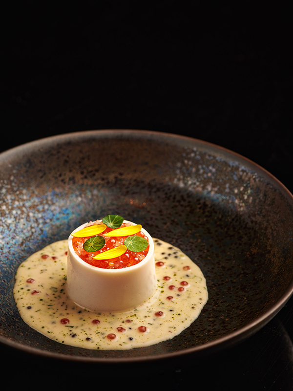 高山三文鱼以盐水腌制,搭配苹果木进一步冷制烟熏,以呈现海鲜与果香交融的莹润滋味。随后将由鲜奶油与特制黄油混合而成酱汁轻裹其上,再淋置些许由日式高汤、贻贝与葡萄酒汁熬制而成的海苔黄油汁,最后以鱼子酱、手指青柠、昆布、三文鱼籽的点缀。