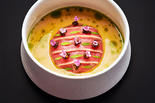 将金枪鱼大腹腌制并轻炙表层后,切至薄片,搭配由河虾与腰果制成的清新泰式柚子沙拉,沁心果香与馥郁海味在齿间碰撞交融,顶部饰以鱼子酱,香菜叶与紫苏花,最后将自制柚子康普茶酱汁漫倾于四周,再点几滴香菜油,演绎出一抹清香灵动的味蕾谐曲。