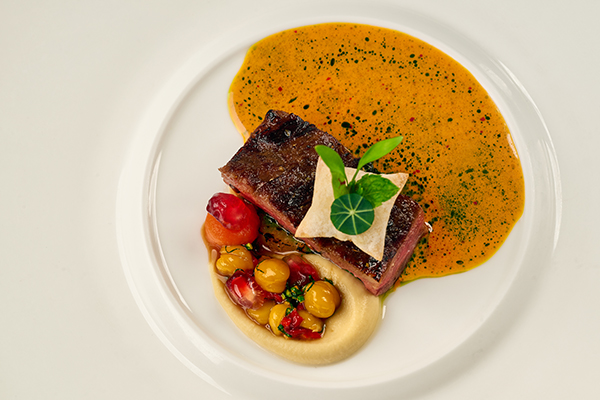 来自泰安门的创意料理,用伊比利亚黑猪梅羽肉展现了多元料理的新境结合。精选梅羽肉先以香料腌制,再经低温慢煮紧锁肉汁,最后在木炭上炙烤至皮酥内嫩,束于烤味噌茄子之上。肉身表层的红椒泥与黎巴嫩皮塔脆饼轻盈相依,中间裹挟着清新法图什沙拉;伴随一侧的鹰嘴豆则以两种形式呈现:细腻鹰嘴豆泥与鹰嘴豆烩菜相辅相成,搭配甜椒与石榴的甘甜,添上一抹蜜意之感。源自巴斯克地区的法式甜椒酱(Sauce Espelette),让风味再度升华。