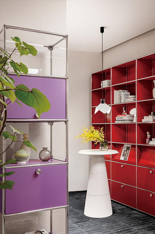 USM Haller家具模块系统的基本原理是:钢管组成模块化结构,通过品牌标志性的专利球形接头连接,然后插入彩色搁板中。系统还可以根据尺寸和功能进行个性化定制,14种颜色的选择满足各类多功能的装饰需求。耐磨的材料、超长的使用寿命和不会过时的设计成就了USM产品的可持续特性。高品质设计和环保主义,USM做到了两者兼具。如今USM Haller模块化家具正代表了USM品牌,凭借其多功能性、耐用性和现代风格而迅速闻名,USM成为了世界一流的家具制造企业。